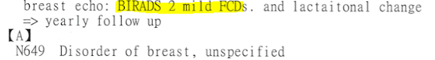 過了幾年,再次門診追蹤時,主治醫師說其實客戶沒事,乳房超音波報告正常,讓客戶重新燃起投保保險的希望,這次改試F公司的純防癌險,其病歷記載如下:
