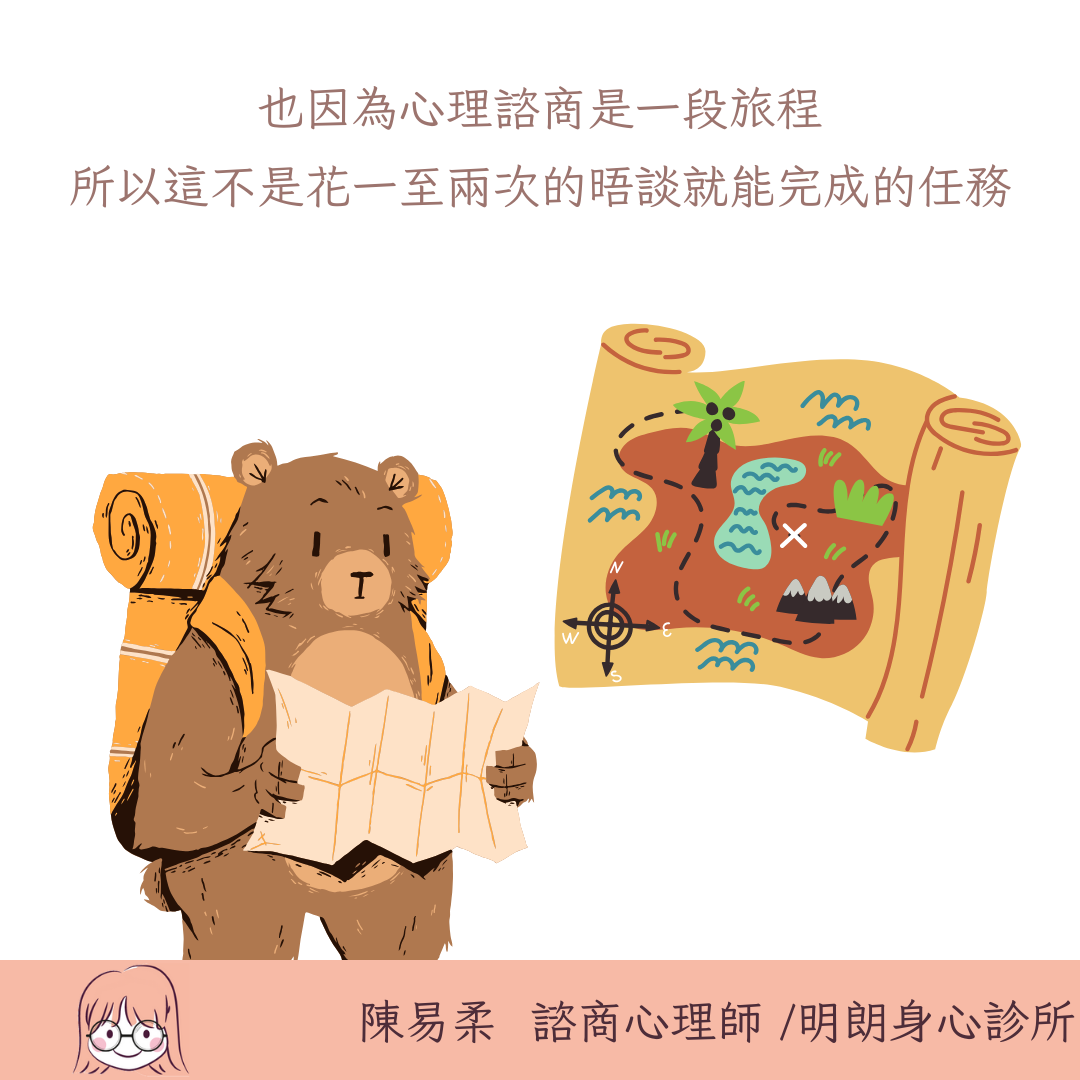 所以不是花一至兩次的晤談就能完成的任務 這取決你想要到達的目的地 我常說:「造就你多年困擾的問題,不可能靠1-2小時的心理諮商就解決。」