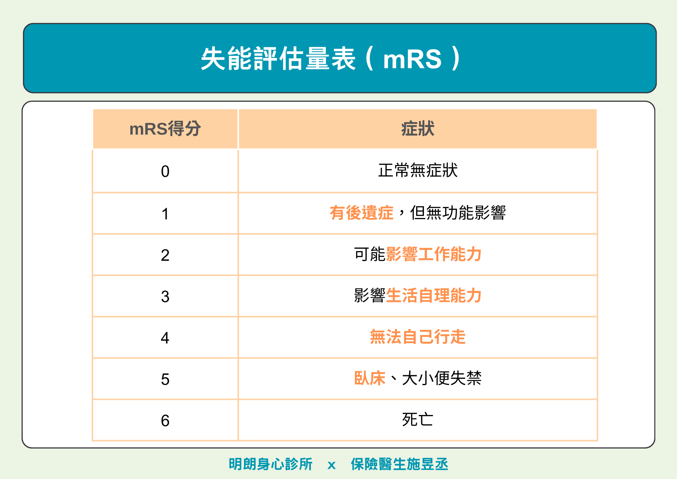 mRS量表除了應用於中風失能評估以外,創傷性腦損傷、腦瘤等疾病,也可以用此量表評估,0-6分,數字越大,代表失能越嚴重