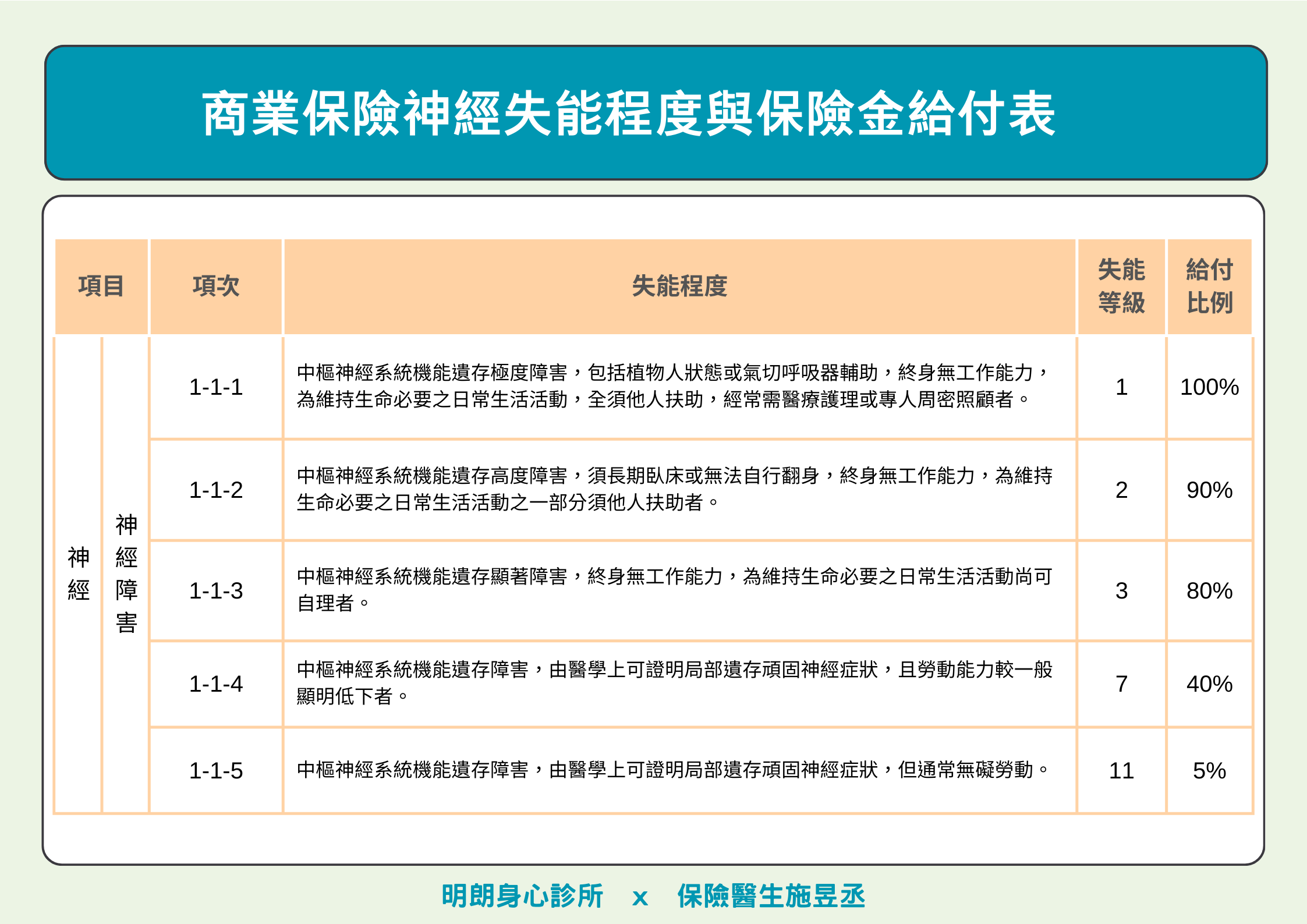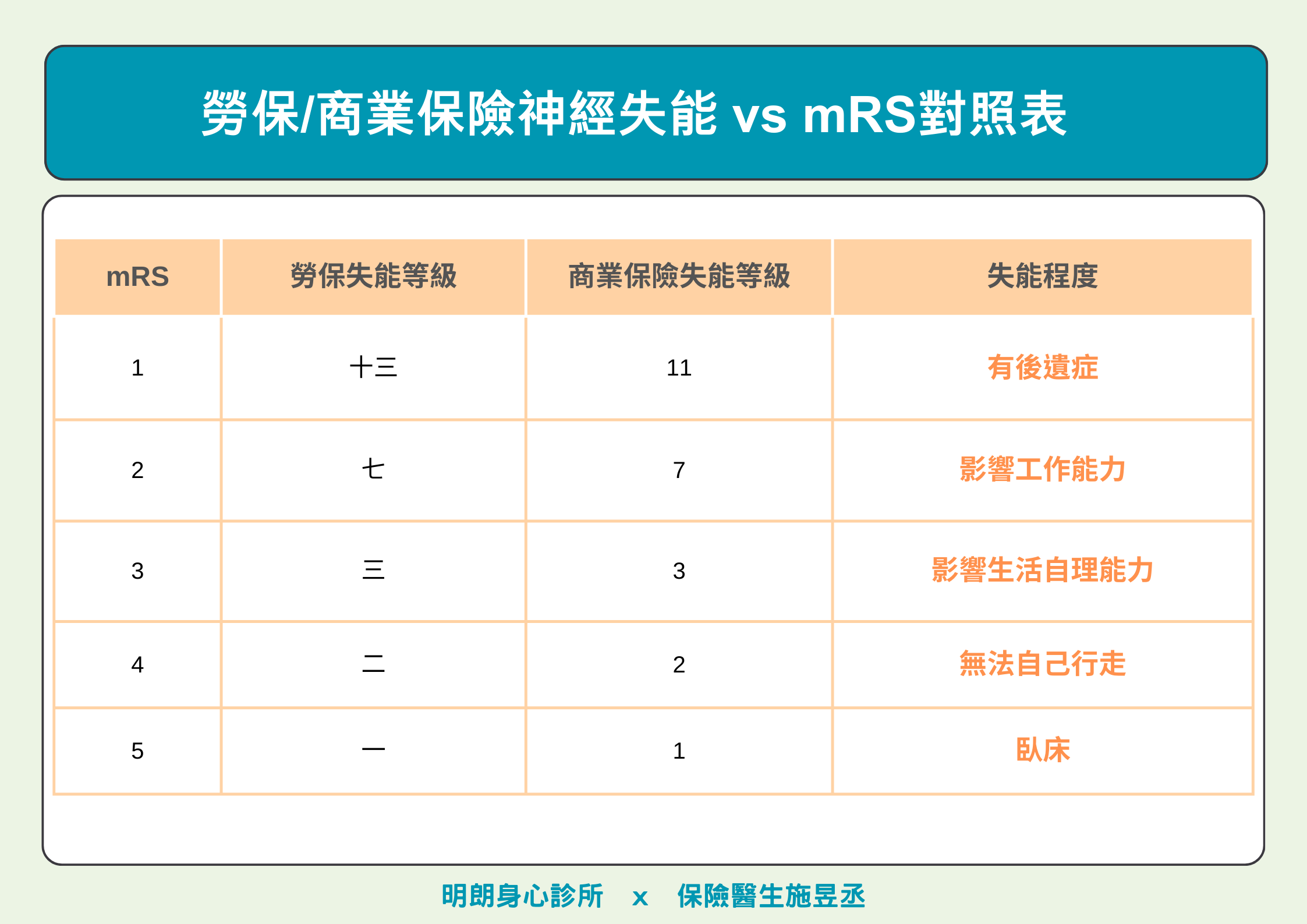 最後我們將勞保/商業保險的神經失能與醫學上的mRS的對照後,方便讓大家可以更清楚的了解。
