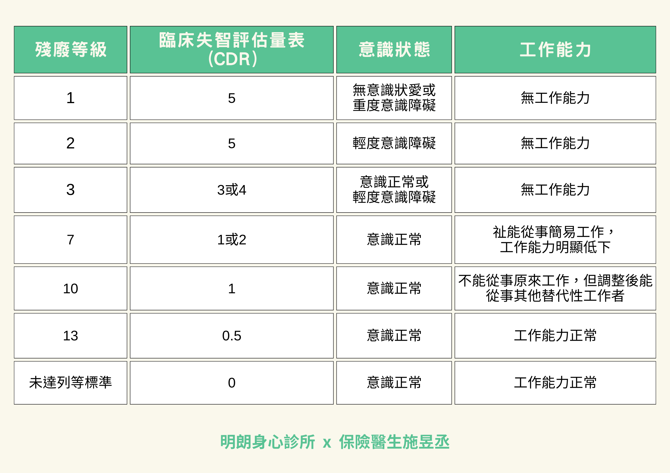 專家的共識是失智症可依照CDR以及對應之工作能力減損,申請失能險給付