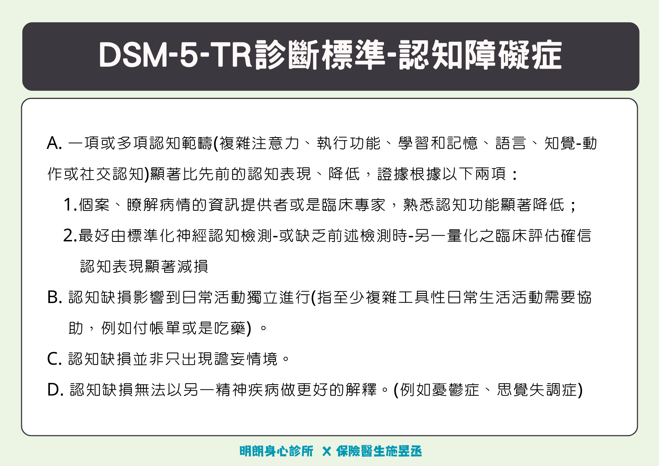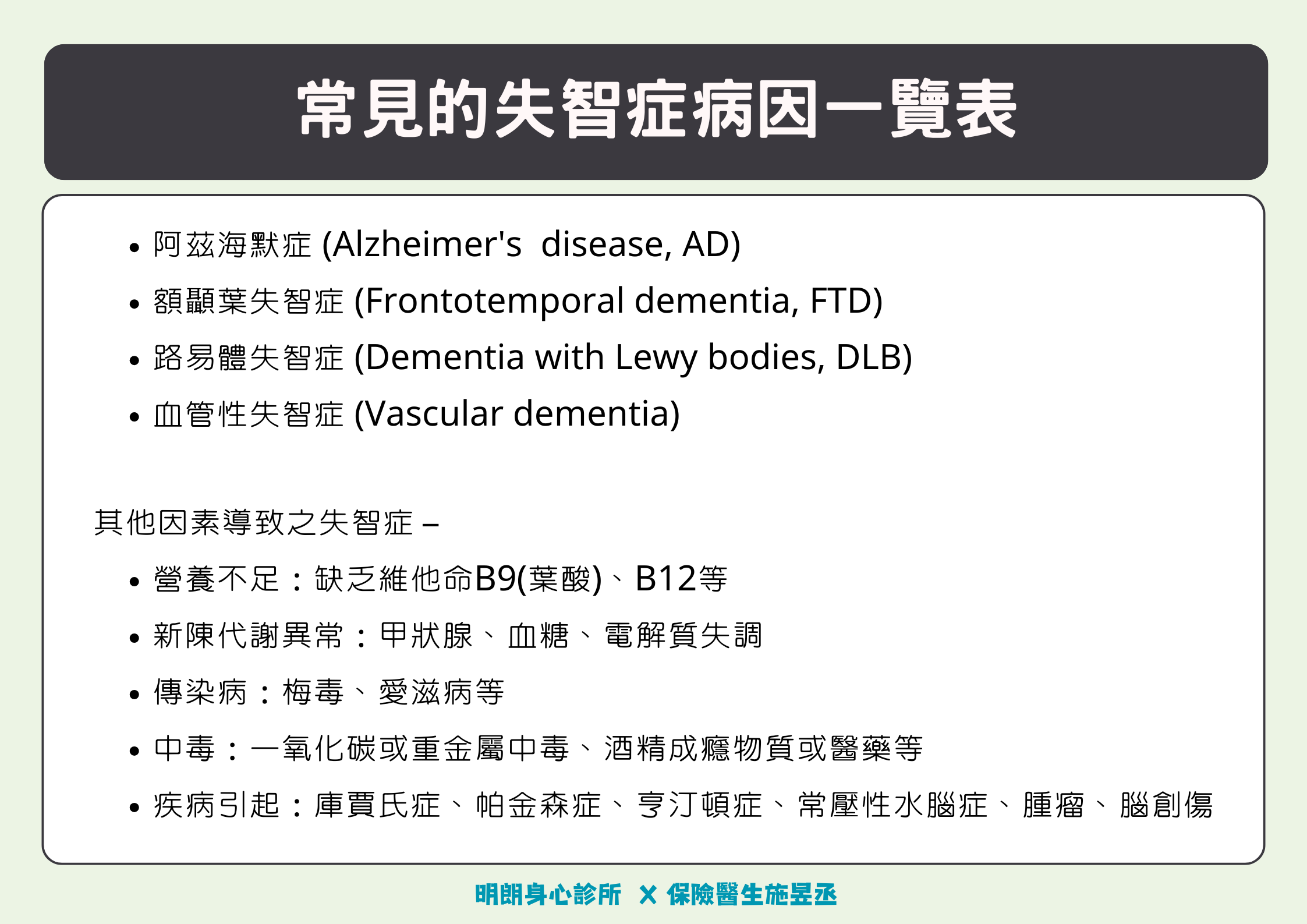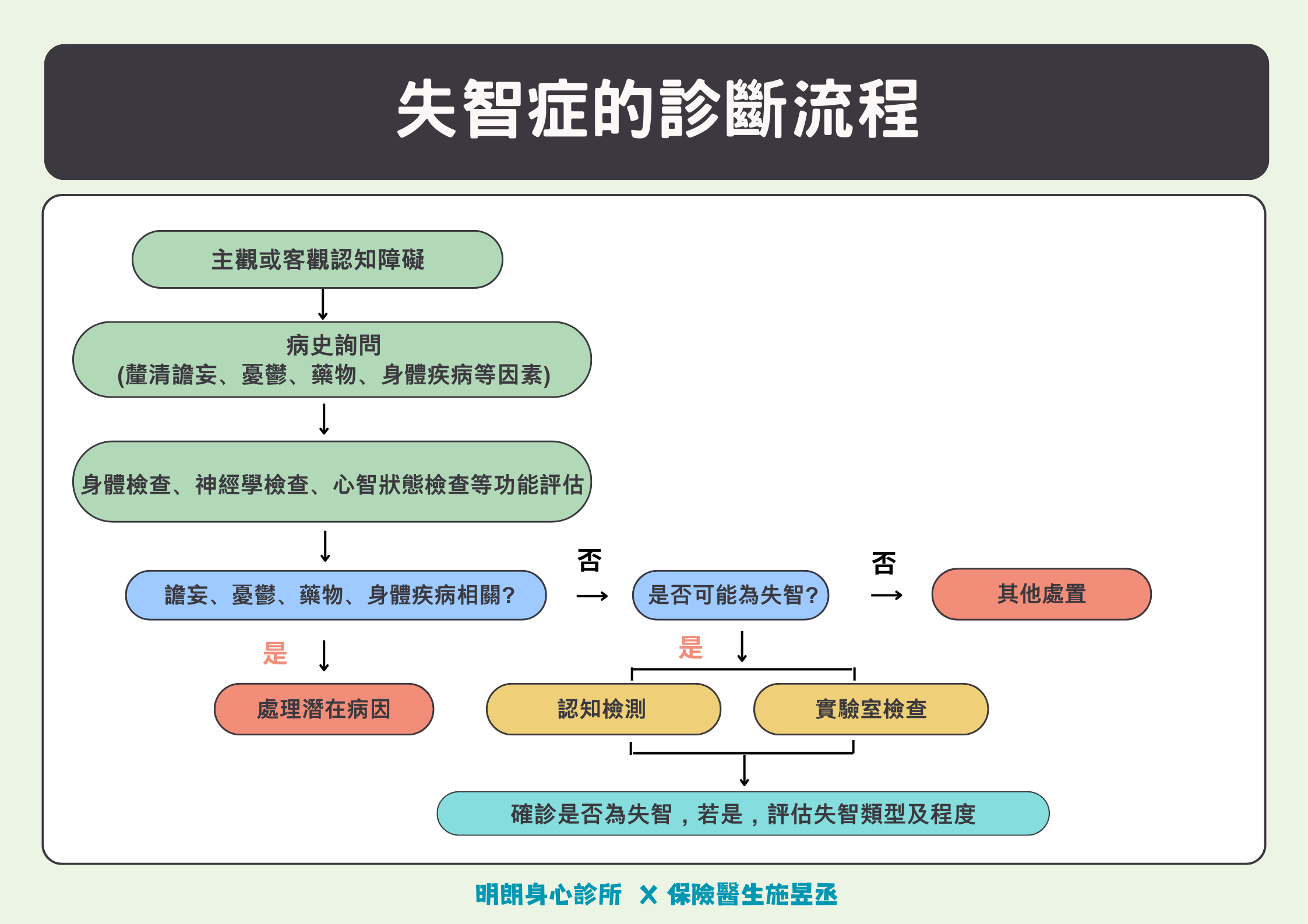 我們神經/精神科醫師對於失智症的診斷,有一定的流程及認定標準,並且失智症的病因與分類,不論在醫界還是保險界,都有相關資料可供參考。